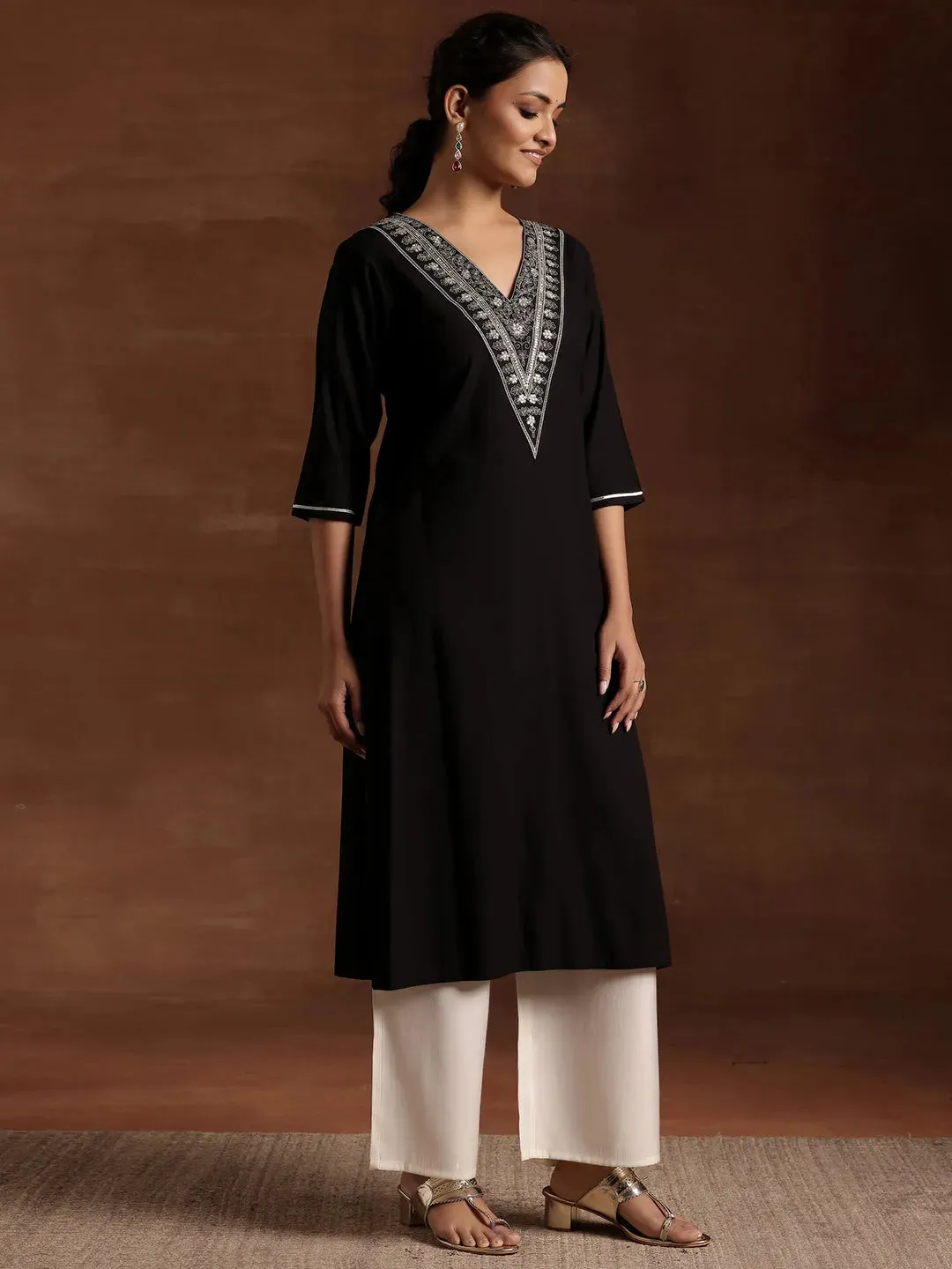 Black Embellished Cotton Straight Kurta
